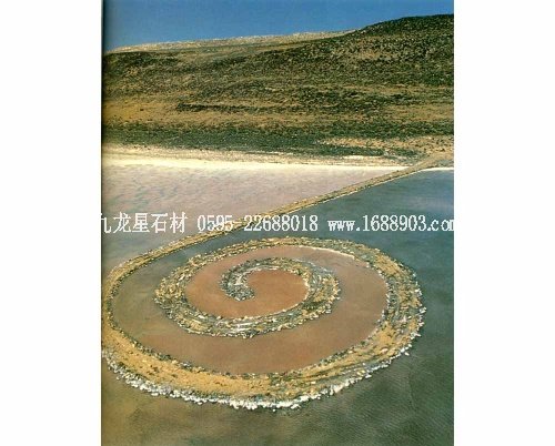 雕塑家羅伯持·史密森以最有震撼力的方式表達了他的這種天才藝術(shù)家思想,在美國猶他州偏遠的大鹽湖筑造了一個名為《螺旋防波堤》的直徑為160英尺、螺旋長1500英尺的巨大旋轉(zhuǎn)空間。他借助大型機械,用當(dāng)?shù)氐暮谏鋷r石、以堆積的這種松散方式塑造了他和大鹽湖的偉大傳奇。