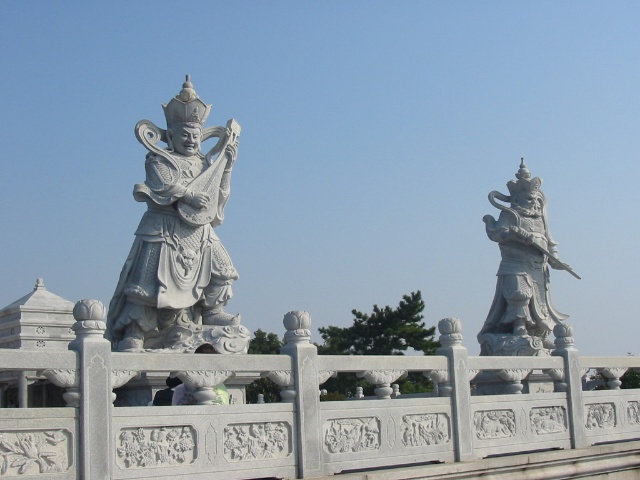 禮佛廣場上四大天王塑成了中國古代的武將形象,這是古印度佛教傳入中國后,佛教文化和中華文化相圓融的結(jié)果。 “這四大天王塑像的原形,他們的出身并不是很高貴,而是屬于那種“放下屠刀,立地成佛”的人物。四大天王原形的由來,源于古典小說“封神演義”中“魔家四將”。在周武王率兵起義,反對暴虐的無道君主——商紂王的正義戰(zhàn)爭中,這魔家四兄弟曾經(jīng)率兵于佳夢關(guān)一線阻擋周武王東進的軍隊。經(jīng)過數(shù)番爭斗,結(jié)果是被周武王的軍隊盡數(shù)殲滅,魔里海、魔里青、魔里壽、魔里紅這四兄弟也亡命于周軍之手。戰(zhàn)爭結(jié)束后,這四個助桀為虐的“魔頭”,經(jīng)姜子牙開封神榜時,就被任命為“四大天王”。
