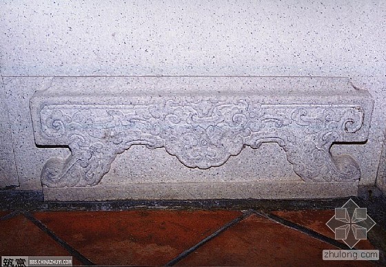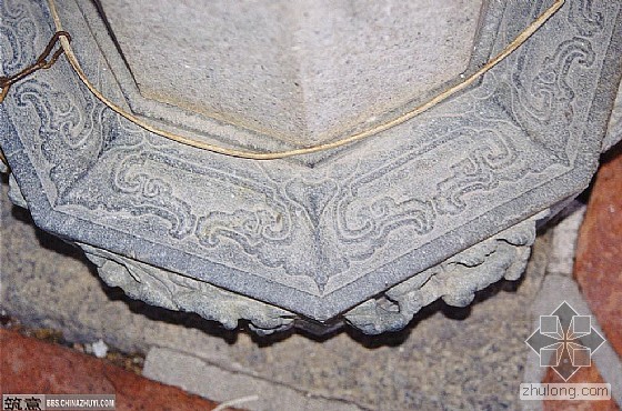 | 圖中左右兩個(gè)壁柱下石作下段也一樣,稍小。和須彌座的圭角一致的是都立于土襯石上。按照劉大可《中國古建筑瓦石營法》標(biāo)準(zhǔn)的須彌座的圭角用如意云。倒是圖中形狀有象龜腳之處;整體應(yīng)該是仿幾案。臺(tái)灣研究閩南古建的學(xué)者稱之為“柜臺(tái)腳”。