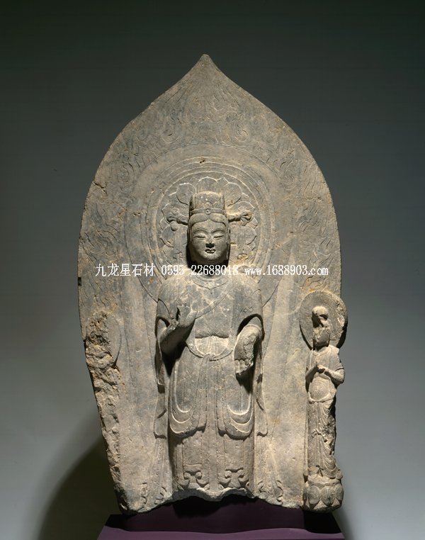 石碑正面雕一佛二菩薩,菩薩腳邊有護(hù)法獅子,現(xiàn)只剩殘?bào)w。佛和菩薩面相清瘦,身軀修長(zhǎng),頭部和手腳近似圓雕,佛裝則以高淺浮雕展示不同層次。如佛身上的漢化褒衣博帶式袈裟和衣裙腳部重疊衣褶的造型。他們身后是火焰形大背光,上面用減地陽(yáng)刻和陰刻手法由中心向外畫(huà)出五個(gè)裝飾圈。中心圈是佛的頭光,內(nèi)有蓮花瓣;旁圈里是過(guò)去七佛;再外圈有六身飛天環(huán)繞,上部有一人形神獸頂一香爐,飛天或持蓮苞、香熏和樂(lè)器,姿態(tài)飄逸清揚(yáng);在此圈的尖頭部分又畫(huà)出第四圈,內(nèi)含一佛像,禪定趺坐于蓮花寶座上,側(cè)脅兩個(gè)飛天;最外圈是飛動(dòng)的火焰圖案。