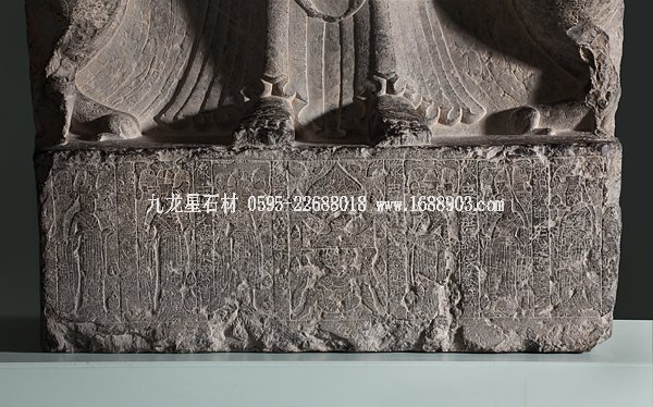 中段是主龕,龕中有高淺浮雕的一坐佛二菩薩二弟子組合,上有飛天回旋。人物較圓潤(rùn)的臉形和裝飾繁復(fù)的懸裳佛座,是這一時(shí)期的典型特征。下段陰刻八位供養(yǎng)人以及題記和發(fā)愿文。石碑的背面在中心雕有一龕,內(nèi)有一佛二菩薩立像,上有十二尊小坐佛,下有題記。