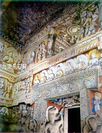 石窟位于山西省大同市西北的武州山北崖上,是我國(guó)三大石窟之一,距今已有1500多年的歷史。整個(gè)石窟依山開(kāi)鑿,東西綿延1公里,現(xiàn)存主要洞窟53個(gè),大小造像51000多個(gè)。石窟雕刻的題材內(nèi)容,基本上是佛像和佛教故事。石窟中最大的佛像是第五窟三世佛的中央坐像,高達(dá)17米。佛像形態(tài)端莊,是中原文化傳統(tǒng)的表現(xiàn)手法,但其臉部形象:額寬、鼻高、眼大而唇薄,卻具有外域佛教文化的某些特征。