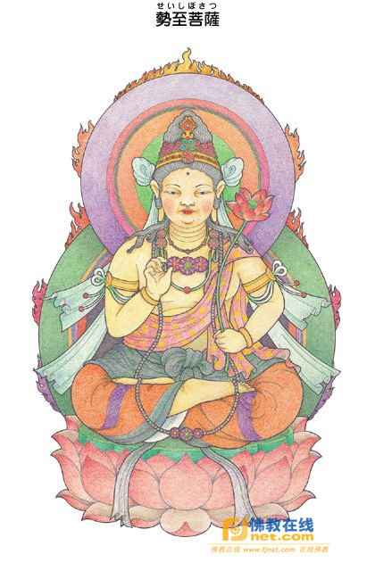 關(guān)于其形像,據(jù)觀無量壽經(jīng)載,其天冠中有五百寶花,一一寶花又有五百寶臺,每一寶臺皆現(xiàn)十方諸佛之凈妙國土相;頂上之肉髻如缽頭摩花,肉髻中安置一寶瓶;其余身相則與觀世音菩薩大同小異。又據(jù)阿唎多羅陀羅尼阿嚕力品載,二菩薩俱呈純金色白焰光,右手執(zhí)白拂,左手執(zhí)蓮花,大勢至之身形較觀世音小。于密教現(xiàn)圖胎藏界曼荼羅中,位于觀音院內(nèi)列上方第二位,全身肉色,左手持開合蓮花,右手屈中間三指,置于胸前,坐于赤蓮花上。密號持輪金剛,三昧耶形為未開敷之蓮花。(大阿彌陀經(jīng)卷上、悲華經(jīng)卷二、法華經(jīng)玄贊卷二、陀羅尼雜集卷一、大日經(jīng)疏卷十三)
