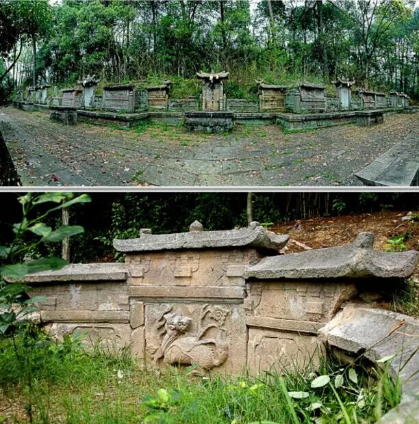 上圖:喬亭馮氏螃蟹形山墓群全景;下圖:祖墓馮伯達(dá)墓環(huán)墉上的麒麟浮雕該墓葬位于赤岸鎮(zhèn)喬亭村下西山螃蟹形山,墓向坐西北朝東南,共有墓葬11座。以祖墓馮伯達(dá)墓為核心,左昭右穆排列,符合傳統(tǒng)的禮制。墓前有供子孫祭奠的甬道、祭臺(tái)和三級(jí)拜臺(tái),還有月池。每座墓前設(shè)石供桌一張,石供桌束腰和圭腳等部位淺浮雕盤長(zhǎng)、方勝與如意云頭等紋飾。墓前立石碑,刻墓主身份、行號(hào)等,廡殿頂碑額,以一斗三升斗栱挑檐。左右兩側(cè)石欄板圍護(hù),有單鉤欄,也有重臺(tái)鉤欄,欄板上浮雕朱雀、麒麟、仙鹿、天馬等祥瑞圖案。墓包土封,設(shè)環(huán)墉。馮伯達(dá)墓屋環(huán)墉上高浮雕麒麟回首圖案,刀法蒼勁古樸,工藝精湛。