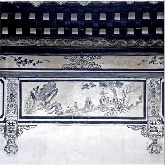 本譜壁畫位于經(jīng)畬堂照墻內(nèi)墻封檐下部位,以道教神話故事為題材,采用國(guó)畫手法,表現(xiàn)司祿星、壽星與正財(cái)神形象。整幅壁畫分為三段,上段用墨線勾畫(白描)連續(xù)的纏枝番蓮紋。中段白描如意云頭組合紋飾,以及纏枝花卉;下段用掛落柱式,分成若干仔屜,每個(gè)仔屜內(nèi)用國(guó)畫法繪山水人物。圖中僅表現(xiàn)一個(gè)仔屜,左側(cè)為山石雜樹,用筆勾畫,點(diǎn)苔,淺墨色暈染。人物采用白描畫法,司祿星居右,老壽星居中,財(cái)神趙公明居左,旁有仙僮。右側(cè)襯以松樹林柯圖。