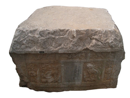 為分體式。桌裙四周刻邊框,框內(nèi)底部為海水波濤,中間有山石,即壽山福海;上部刻雙獅戲繡球。構(gòu)圖雖簡(jiǎn)單,但布局勻稱。造型準(zhǔn)確而動(dòng)感強(qiáng),突出了獅子的威猛。上有紀(jì)年款銘:嘉慶十九年(1814年)。