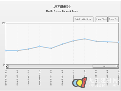 本周大理石類價格環(huán)比略有下滑,價格指數(shù)收報于97.78點,下調(diào)0.10點,下調(diào)0.10%。本周大理石類價格指數(shù)繼續(xù)延續(xù)近期下行的走勢、微幅下調(diào),成品價格持續(xù)略微上揚,荒料及大板價格皆繼續(xù)下滑。本周部分大理石大板價格隨市場需求情況正常浮動、少數(shù)因板面質(zhì)量較差價格微幅下調(diào)。成品價格整體較穩(wěn)定,部分因市場行情及板面質(zhì)量向好而略上揚。