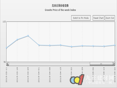 花崗石類本周價格指數(shù)為99.76點,小幅推升0.24點,推升0.24%。本周花崗石價格穩(wěn)中有升,其中荒料、成品價格均小幅上揚,大板價格則繼續(xù)與上周基本持平。個別花崗石荒料本周因材質(zhì)較好,價格小幅回升;而部分成品價格因板面優(yōu)及市場需求增加而小幅推升。