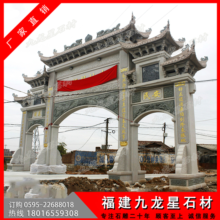 石牌坊定做一般都是選用青色或茶色的石料,上面雕刻最多、也。最為精彩的地方要數(shù)明間牌坊的中間大門的橫梁。在牌坊的石雕貔貅麒麟等飾物形式,現(xiàn)在大多是以美的形式展現(xiàn)在我們面前,給人以美感。因此,它對現(xiàn)代藝術(shù)設(shè)計(jì),對現(xiàn)代生活的審美內(nèi)容都產(chǎn)生了巨大的影響,構(gòu)成一種新的文化現(xiàn)象,即民族民間文化以獨(dú)特的形式內(nèi)容滲透到高度發(fā)達(dá)的現(xiàn)代文明中。