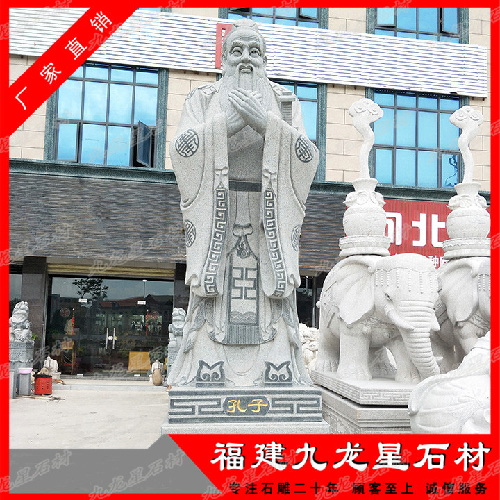 孔子石雕像樣式選擇性不算太大,現(xiàn)在我們看到的孔子形象大多是根據(jù)唐朝的吳道子所畫的孔子像來進行創(chuàng)作雕刻的,長眉長須,身著寬大的儒服,衣袂飄飄,栩栩如生,因此非??简灥窨處煾档墓に?,達到石雕像的真實感,表情惟妙惟肖。一般比較常見的孔子石雕像有比較簡單的頭像,也有站姿的石雕像,基本上站立姿勢的石雕像選擇性更受到人們喜愛,有手里握著書卷拿在胸前,一手背在身后,抬頭挺胸,眼神眺望的石像,也有將雙手交叉并在胸前,但是我們可以看到交疊的手是不露出大拇指的,象征著謙恭有禮,而四指并攏,也代表著四海之內(nèi)皆兄弟,有著友愛、友誼的象征意義。