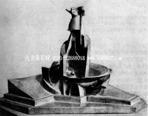 波菊尼在《未來主義雕塑技巧的宣言》中主張“絕對和完全廢除確定的線條和不要精密刻劃的雕塑。我們要把人物打開, 把它納入境之中……透明的玻璃、鐵塊、金屬絲、室內(nèi)和室外的燈光能夠表示平面、方向以及一種新的現(xiàn)實的調(diào)子和中間調(diào)子”。(6)未來主義者就是希望達到讓作品與環(huán)境、形體與空間互相貫穿。波菊尼在他的《空間中一個瓶子的發(fā)展》這件靜物雕塑上, 傳統(tǒng)的雕塑空間被擴大。瓶子被解體后又重新構(gòu)成, 但作品此時已經(jīng)和介于它與環(huán)境之間的基座融為一體, 呈現(xiàn)一種向空間極度擴張的態(tài)勢。這件僅有15英寸高的青銅作品卻能盤居著一個巨大的空間量。他還通過其它作品的實驗,驗證了他在雕塑中所追求的永久價值——“運動的風(fēng)格”和“雕塑即環(huán)境”, 而這反倒是另一種對“未來”的預(yù)言:其“運動”真的波及到達達主義、超現(xiàn)實主義雕塑以及波普雕塑家環(huán)境流派的“環(huán)境”觀。