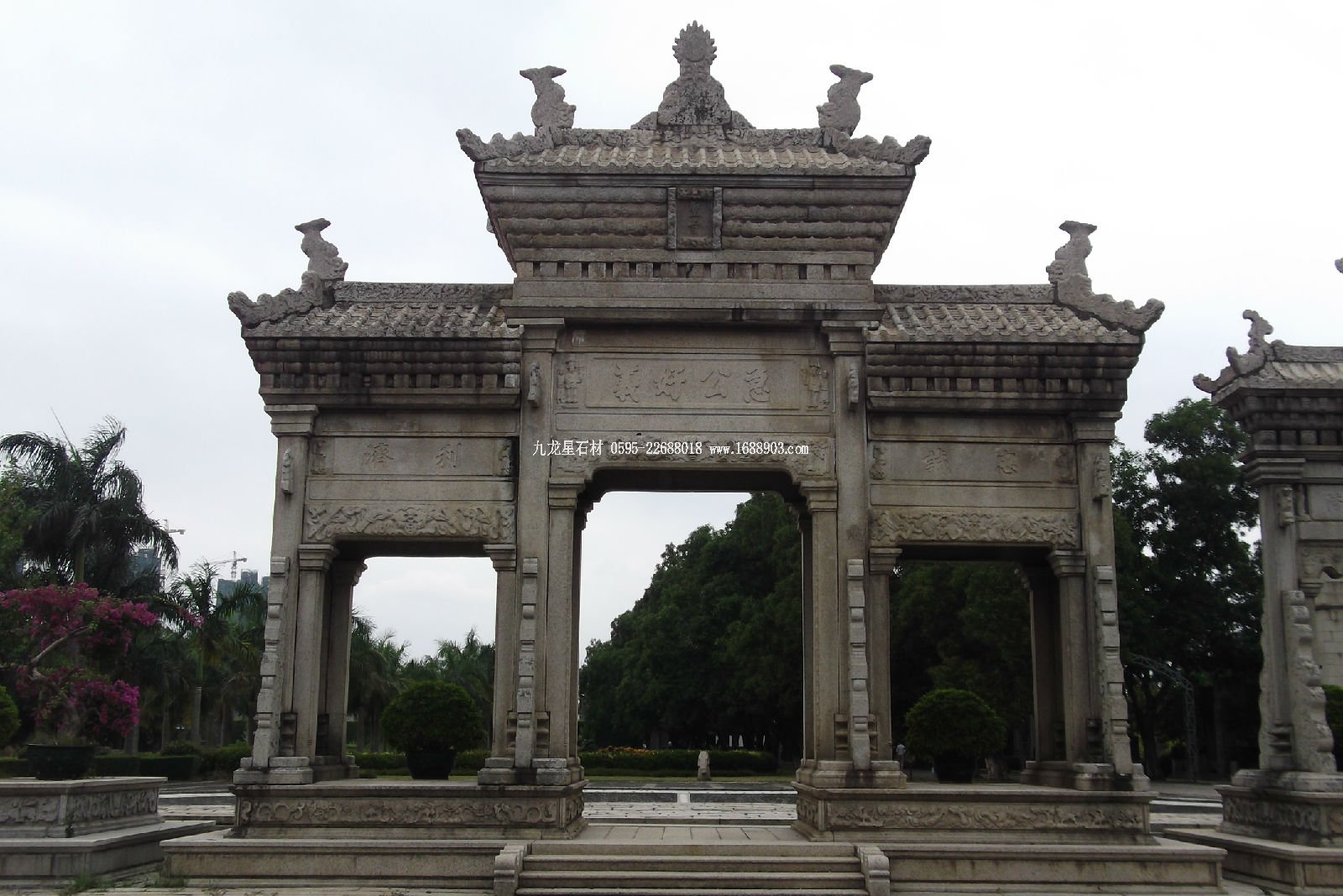 解放后因擴建馬路需要移走,一建公司的師傅們連夜施工,整拆整蓋,原樣又建在了城南的陶然亭公園,多好的東西啊!‘文革’中楞把它說成是“四舊”,下場是被砸爛、棄之。 寺院石雕山門 北京齊化門(今朝陽門)外神路街口的琉璃牌樓是北京同類牌樓中最大的,那是老東岳廟的遺物,現(xiàn)在掛上了“文物保護’的牌子。整個北京城保存下來最大的石牌樓得數(shù)明十三陵的牌樓,是六柱五間十一樓,建于嘉靖十九年,至今有小五百年的光景啦。這牌樓高十四米多,長有二十九米,梁朽、斗拱、屋頂都是仿木制結(jié)構(gòu)的形制雕刻成的。梁朽上雕刻出旋子點金彩畫,從殘存的顏色還能隱約看出當年石坊上曾經(jīng)有過美麗的彩繪。在石坊六根方柱石下是巨大的夾柱石(又叫袍柱石座),石上雕刻著巨龍、海獸、獅子、麒麟和云氣波濤,鬼斧神工的匠術(shù)令人贊嘆不已。 今天,古老的北京在保護和修葺古老牌樓的同時,一些新的牌樓也拔地而起:王府飯店前面的牌樓,琉璃廠文化街的牌樓,紫玉飯店的牌樓,地壇公園西門外的牌樓,還有老北京微縮景園的牌樓……得,聊這么會子啦,今兒個就先到這兒,您抽功夫迢彎,看看這些個牌樓那不也是件有意思的事嗎?興許到時咱們還能碰上,到那時我沏上壺好茶再跟您慢慢聊吧!.