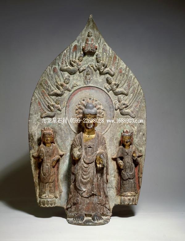 4至6世紀(jì)的南北朝是中國(guó)佛教造像的啟蒙和黃金時(shí)代,尤以制作精美的北朝造像聞名于世。北魏晚期佛像造型已顯成規(guī),表現(xiàn)為軀體趨平板狀,線條概括、洗練,又富裝飾性,加上長(zhǎng)眉、細(xì)眼及抿唇微笑的臉相,洋溢著一種既莊嚴(yán)又清秀的審美品味。館藏的佛三尊立像是這一時(shí)期造像碑作品的典范。