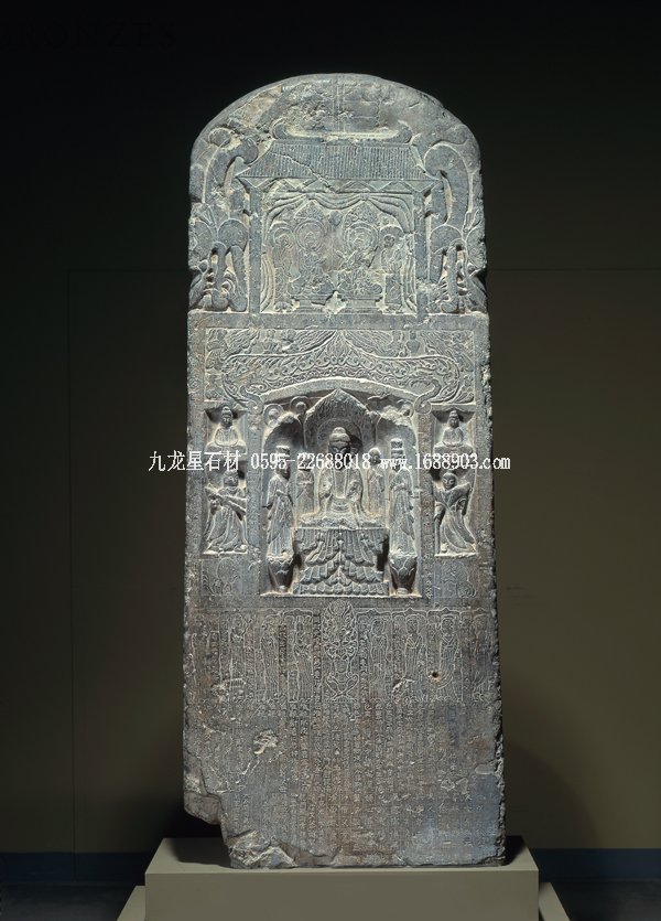 佛造像碑,西魏,公元549年,石灰?guī)r館藏的西魏石碑集兩種造像碑式樣于一體,即雙面數(shù)層佛龕式和千佛碑式。石碑正面是三段式構(gòu)圖。上段用減地陽(yáng)刻加陰刻的技法刻畫(huà)出維摩詰居士和文殊菩薩論法圖。人物刻畫(huà)秀骨清風(fēng),頗有魏晉名士風(fēng)流之韻。
