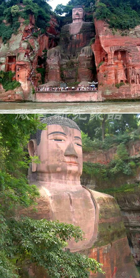 樂山大佛,地處中國(guó)四川省樂山市,岷江、青衣江和大渡河三江匯流處,建于唐朝時(shí)期。大佛雕像通高71米(約23000英尺),游客們就像小矮人一樣圍繞其四周觀看。其面向峨眉山矗立在三江的‘聚會(huì)場(chǎng)所’。過去的二十年,大佛飽受自然風(fēng)雨和污染的侵蝕。幸運(yùn)的是,在2008年的四川大地震中大佛并沒受到損壞。