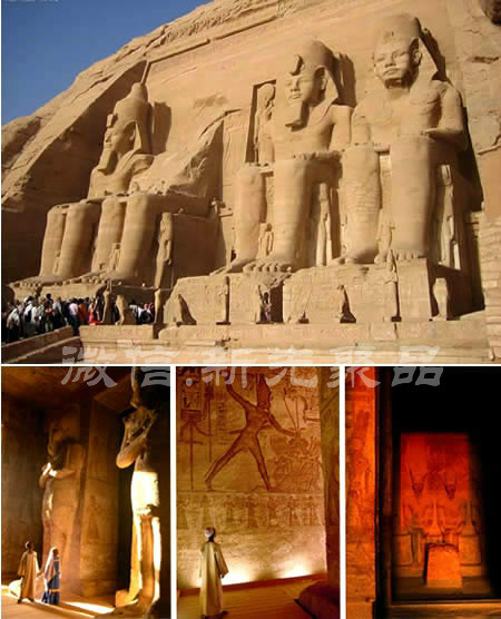 阿布辛貝位于埃及與蘇丹交界,公元十三世紀(jì)時(shí),這所宮殿是給當(dāng)時(shí)在位67年的法老拉美西斯二世修建的。二十世紀(jì)六十年代,由于納賽爾湖水的上漲,建造阿斯旺大壩的時(shí)候,為了防止被淹,神廟被切割成石塊遷移至高于河床的后山上再重新按原樣完成組裝。