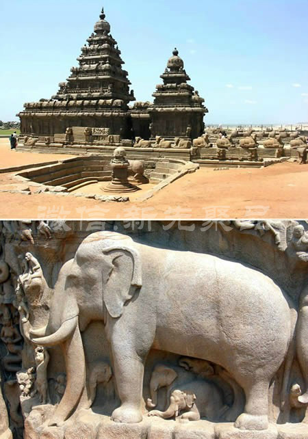 馬哈巴利普蘭岸上寺,8世紀(jì)初由帕拉瓦國(guó)王Rajasimha建于印度的馬哈巴利普蘭海灣。實(shí)際上由兩座背靠背的神殿組成,一座面向東方,較小的則面向西方。岸上寺屹立在孟加拉灣的邊緣。漲潮時(shí),海浪會(huì)拍打寺體,墻壁即周邊的雕塑已經(jīng)歷經(jīng)了1300年的風(fēng)吹浪打,卻依舊安然無恙。