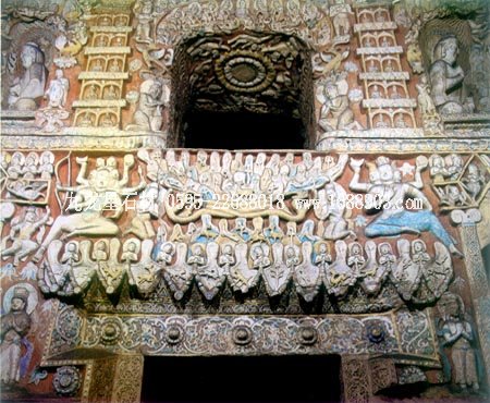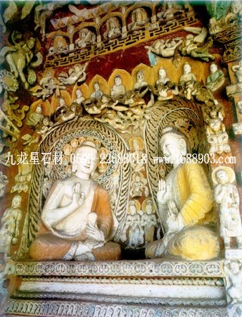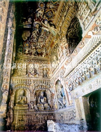 石窟位于山西省大同市西北的武州山北崖上,是我國(guó)三大石窟之一,距今已有1500多年的歷史。整個(gè)石窟依山開(kāi)鑿,東西綿延1公里,現(xiàn)存主要洞窟53個(gè),大小造像51000多個(gè)。石窟雕刻的題材內(nèi)容,基本上是佛像和佛教故事。石窟中最大的佛像是第五窟三世佛的中央坐像,高達(dá)17米。佛像形態(tài)端莊,是中原文化傳統(tǒng)的表現(xiàn)手法,但其臉部形象:額寬、鼻高、眼大而唇薄,卻具有外域佛教文化的某些特征。